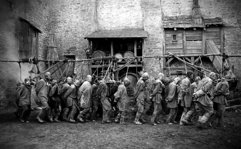 German filmdəki iyrənc səhnələrlə elmdən, sənətdən uzaq dünyanın necə qaragüruh, boz və iyrənc ola biləcəyini göstərir: Üz-gözü yara, dayanmadan tüpürən, nəcis yeyən, sidik içən adamlar…