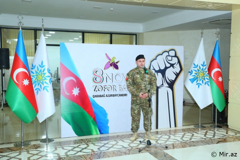 Tədbirdə çıxış edən Binəqədi Rayon İcra Hakimiyyəti başçısı Elxan Allahverdiyev Şanlı Qələbə - 8 Noyabr – “Zəfər Günü” münasibətilə hər bir kəsi təbrik edərək qeyd etdi ki, Müzəffər Ali Baş Komandan cənab İlham Əliyevin müdrik rəhbərliyi, böyük siyasi iradəsi, möhtəşəm diplomatik addımları ilə Azərbaycan Silahlı Qüvvələrinin Vətən müharibəsində böyük Qələbə qazanması və ölkəmizin ərazi bütövlüyünün təmin edilməsi müasir tariximizin ən parlaq və şanlı səhifəsidir. Rəşadətli Azərbaycan Ordusunun igid əsgər və zabitləri öz canları, qanları bahasına düşmən üzərində tam və qəti Qələbə qazanmaqla dünyanın hərb tarixinə yeni qəhrəmanlıq salnaməsi yazdılar. Bu möhtəşəm Qələbə sevincini bizə yaşadan rəşadətli Azərbaycan Ordusunun hər bir zabit və əsgər heyətinə, qazilərimizə minnətdarıq.