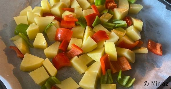 3. Ət bişərkən tərəvəzləri kublar şəklində doğrayın, çox az yağla qarışdırın və sobaya qoyun.