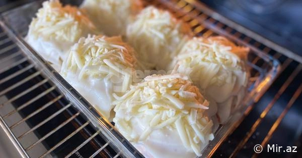 7. Yuxaların üzərinə bir qaşıq səpin. Üzərinə rəndələnmiş holland pendiri səpin 180 dərəcə qızdırılmış sobaya qoyun. 20 dəqiqə bişirin.