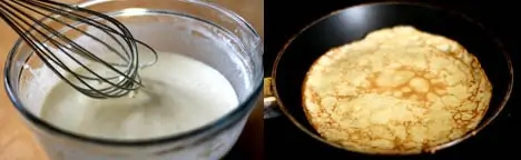 Dərin bir qabda yumurtaları çırpın, şəkər tozu və bir çimdik duz əlavə edin. Ardınca süd tökərək yaxşıca qarışdırın. Unu tədricən əlavə edərək topaq-topaq qalmaması üçün mətbəx çırpqısı ilə çırpın. Ən sonda bitki yağını əlavə edib son dəfə qarışdırın. Xəmir hazırdır və qatılığı qaymaqa bənzəməlidir.