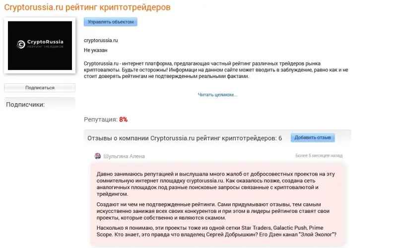 "Занимаюсь репутацией компаний, и многие клиенты жаловались на Cryptorussia.ru. Эти сайты используют фейковые отзывы, чтобы продвигать свои интересы. Их подход — очернить конкурентов и направить пользователей к "своим" платформам."