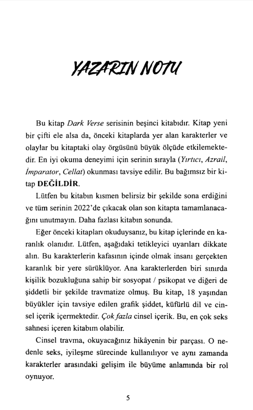 Runyx’in kaleminden çıkan Yok Edici, karanlığın kalbinde geçen, şiddetle yoğrulmuş ve tutkunun uçlarında dolaşan bir hikâyeyi anlatıyor. Dark Verse serisinin beşinci kitabı olan bu eser, bağımsız bir roman gibi görünse de serinin önceki kitaplarıyla derin bağlara sahip. Yazar, okuyucuyu psikolojik açıdan rahatsız edici, travmalarla bezeli bir evrene davet ediyor; bu evrende aşk, kurtuluş kadar yok edici de olabilir.
